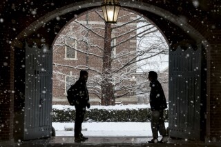 FILE - Wheaton College students stop to chat on the Norton, Mass. campus, Feb. 13, 2024 as snow falls. More than 75 million student loan borrowers have enrolled in the U.S. government’s newest repayment plan since it launched in August. (Mark Stockwell/The Sun Chronicle via AP, File)