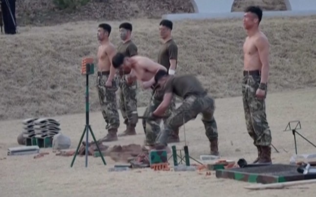 Kim smiled as his country’s soldiers launched themselves on top of concrete slabs and broke bricks with their heads.