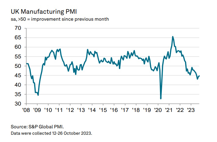 In October, the seasonally adjusted UK Manufacturing PMI rose slightly to 44.8, up on September’s reading of 44.3 but below the earlier flash estimate of 45.2. A reading below 50 suggests contraction in the sector and we have now been in this territory for 15 months.