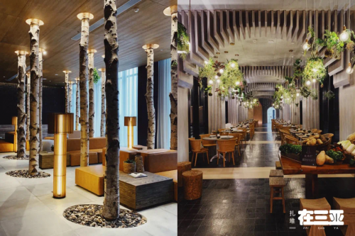 The One Hotel in Haitang Bay is a model of environmental innovation. Its design features locally sourced volcanic stone and traditional blue bricks and black tiles, evoking a natural, rustic feel in the lobby. The hotel incorporates green walls with automatic irrigation and ample natural light, blending seamlessly with the surrounding environment. Recycled materials are visible throughout, from garden landscapes to wall panels, corridors, and even elevators. The hotel also implements eco-friendly measures like card holders made from recycled wood, paper hangers, and wine-bottle water cups, actively promoting sustainability.