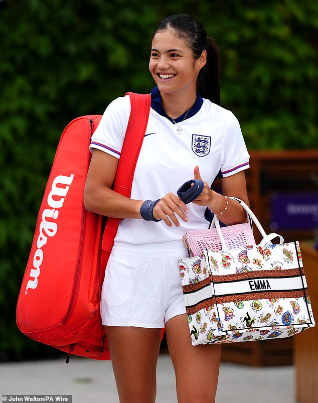 Raducanu turned up clutching a personalised Dior bag bearing her first name and decked out in a full England kit with shirt and shorts.