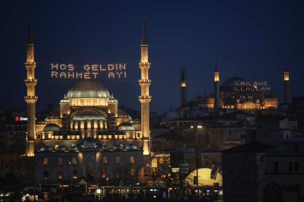 Light messages installed in the Yeni mosque, or New mosque, left, read in Turkish “Welcome month of mercy,” and in Hagia Sophia mosque “There is no God but Allah” ahead of the Muslim holy month of Ramadan, in Istanbul, Turkey, Sunday, March 10, 2024. (AP Photo/Emrah Gurel)