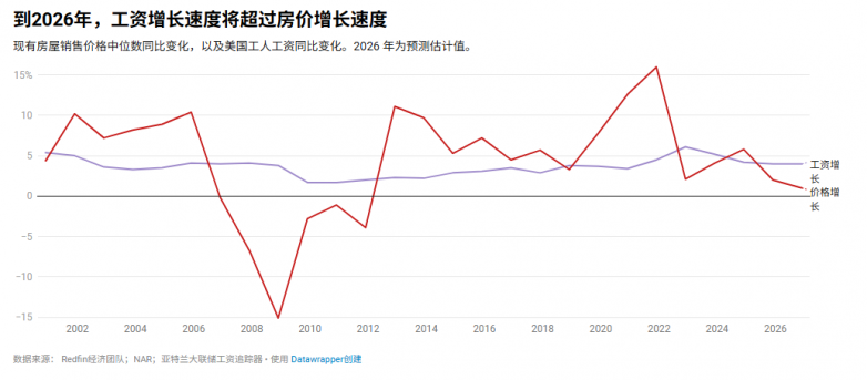 (Image: By 2026, wage growth will outpace housing price growthYear-over-year changes in the median existing home sales price and U.S. workers' wages. 2026 figures are forecast estimates.Data sources: Redfin Economic Team; NAR; Atlanta Fed Wage Tracker · Created with Datawrapper)