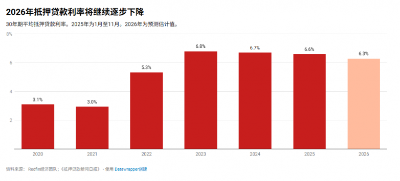 (Image: Mortgage rates will continue to decline gradually in 2026Average 30-year mortgage rate. 2025 data covers January to November. 2026 figures are forecast estimates.Data sources: Redfin Economic Team; Mortgage News Daily · Created with Datawrapper)