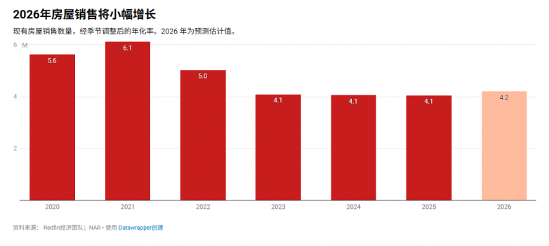 (Image: Home sales will increase slightly in 2026Number of existing home sales, seasonally adjusted annual rate. 2026 figures are forecast estimates.Data sources: Redfin Economic Team; NAR · Created with Datawrapper)