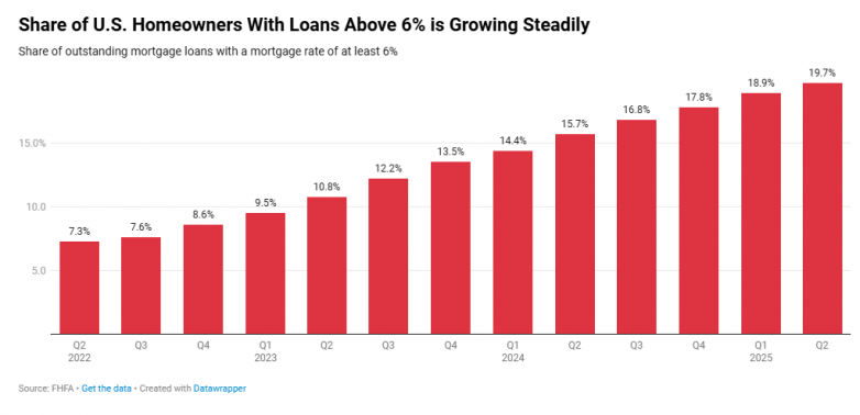 (Image: Share of U.S. Homeowners With Loans Above 6% is Growing Steadily Share of outstanding mortgage loans with a mortgage rate of at least 6%Source: FHFA · Get the data · Created with Data wrapper)