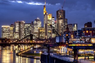 FILE - The buildings of the banking district are pictured in Frankfurt, Germany, on Feb. 19, 2024. Germany businesses remain mired in pessimism despite a small uptick in the latest survey, as Europe’s largest economy struggles with shortages of skilled labor, slower global trade, and political squabbling. (AP Photo/Michael Probst)